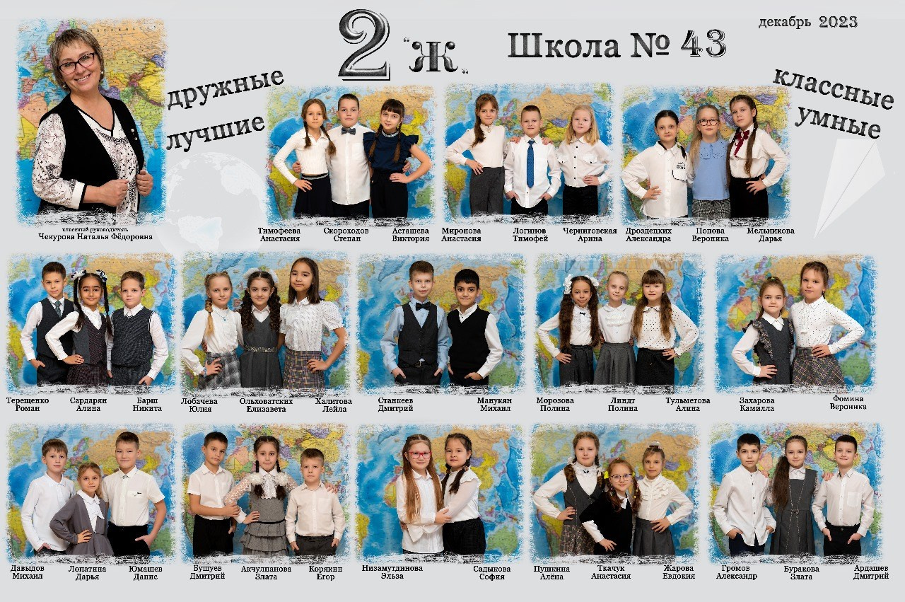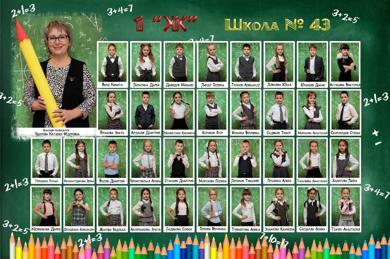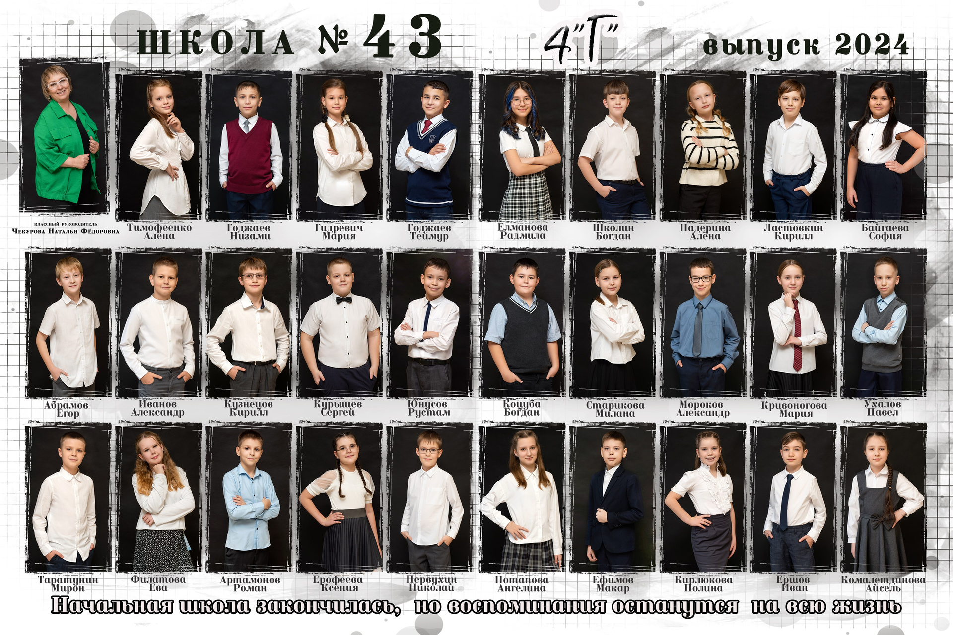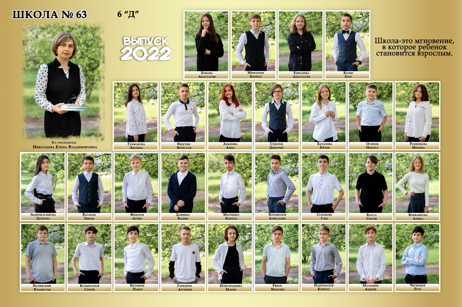 - внутри: общая фотография в виде виньетки (величина виньеток зависит от кол-ва человек), а так же индивидуальная фотография ребенка или фото с друзьями